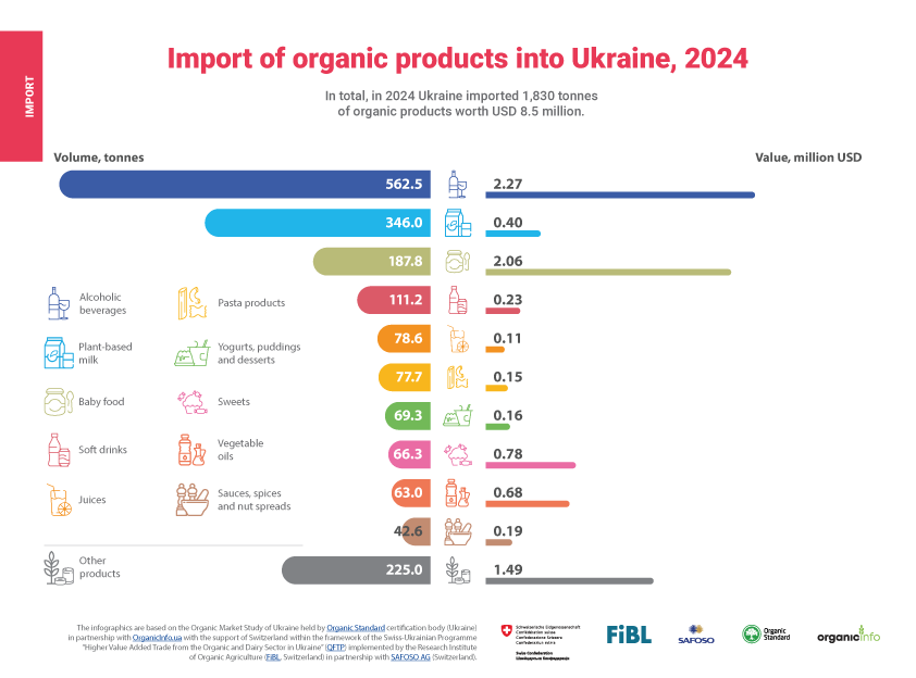 The infographics are based on the Organic Market Study of Ukraine held by Organic Standard certification body (Ukraine) in partnership with OrganicInfo.ua with the support of Switzerland within the framework of the Swiss-Ukrainian Programme “Higher Value Added Trade from the Organic and Dairy Sector in Ukraine” (QFTP) implemented by the Research Institute of Organic Agriculture (FiBL, Switzerland) in partnership with SAFOSO AG (Switzerland).