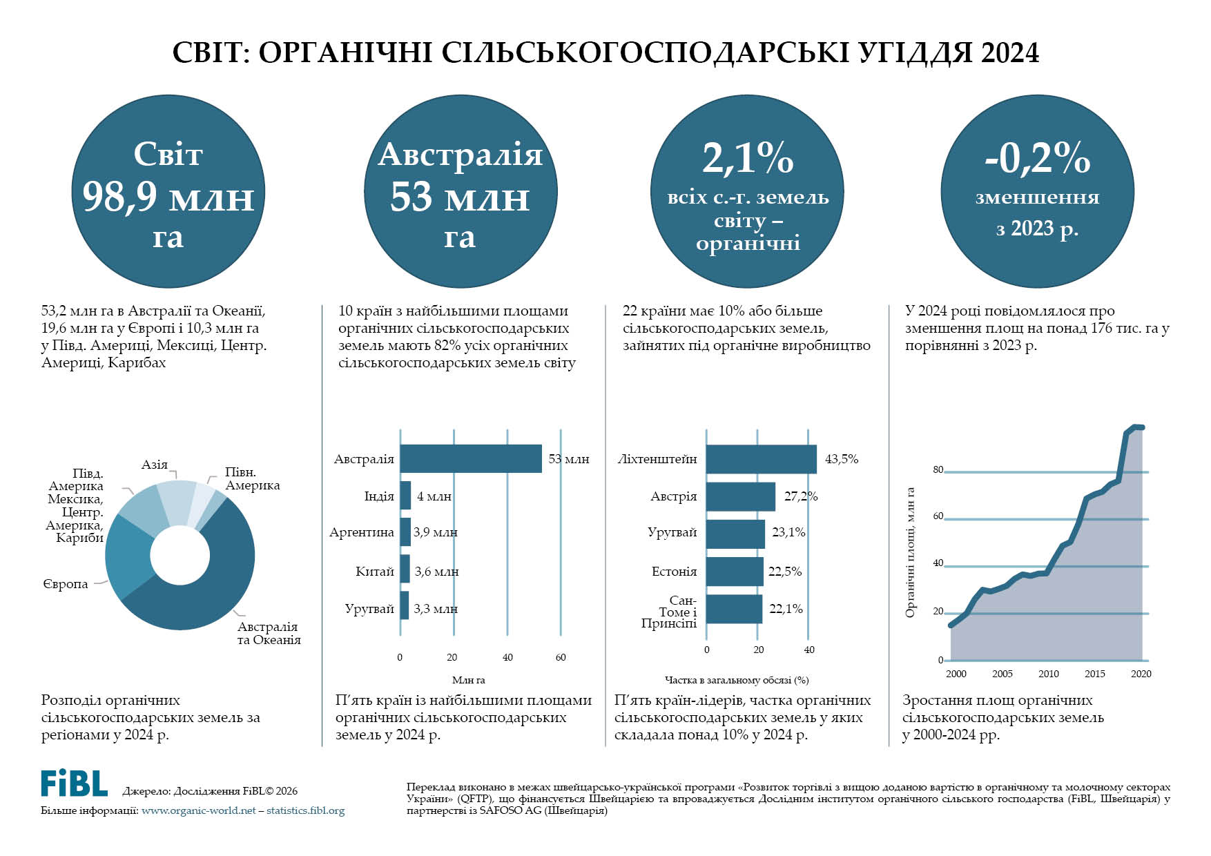 – інфографіка з щорічного довідника в галузі органічного сільського господарства, що містить інформацію з усього світу “Світ органічного сільського господарства 2026” станом на 31.12.2024.