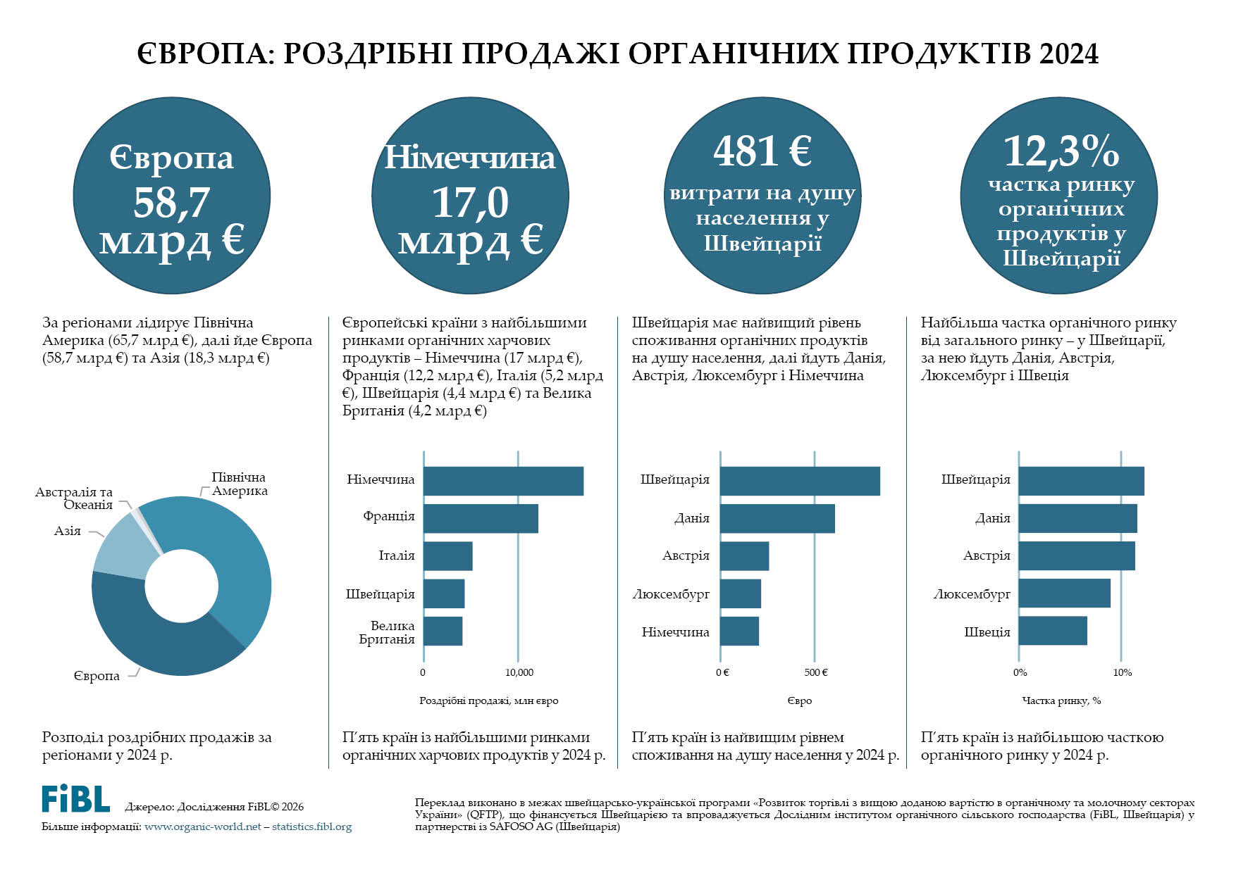 – інфографіка з щорічного довідника в галузі органічного сільського господарства, що містить інформацію з усього світу “Світ органічного сільського господарства 2026” станом на 31.12.2024.